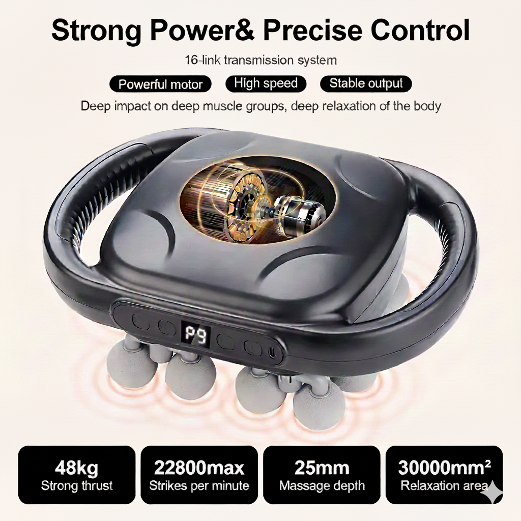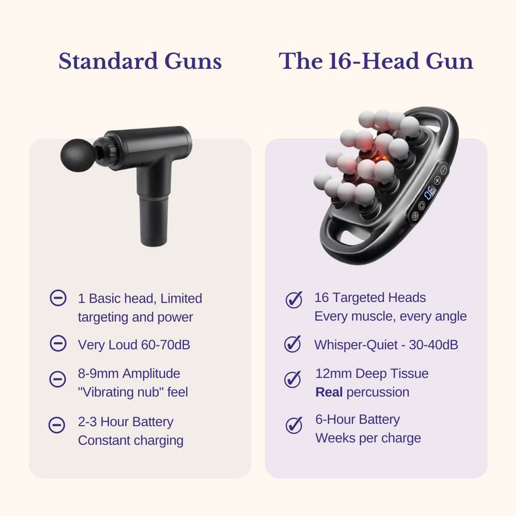 Unlike single-head, noisy massagers, our 16-head system delivers targeted, hands-free percussion that reaches deeper muscle fibres quietly and comfortably. Practical, portable, and built for daily use.